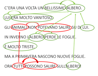 Ad esempio, se nel testo c’era la parola TUTTI, era necessario comprendere di quali referenti essa era una ripresa anaforica (tutti gli animali? Solo alcuni? Gli animali e l’albero? Ecc.). I bambini si sono accorti di dare a volte risposte “flettolose” e non giustificate dal punto di vista testuale. In questi casi erano loro stessi a correggersi, anche dando vita a discussioni su quale colore usare per questa o quella parola!